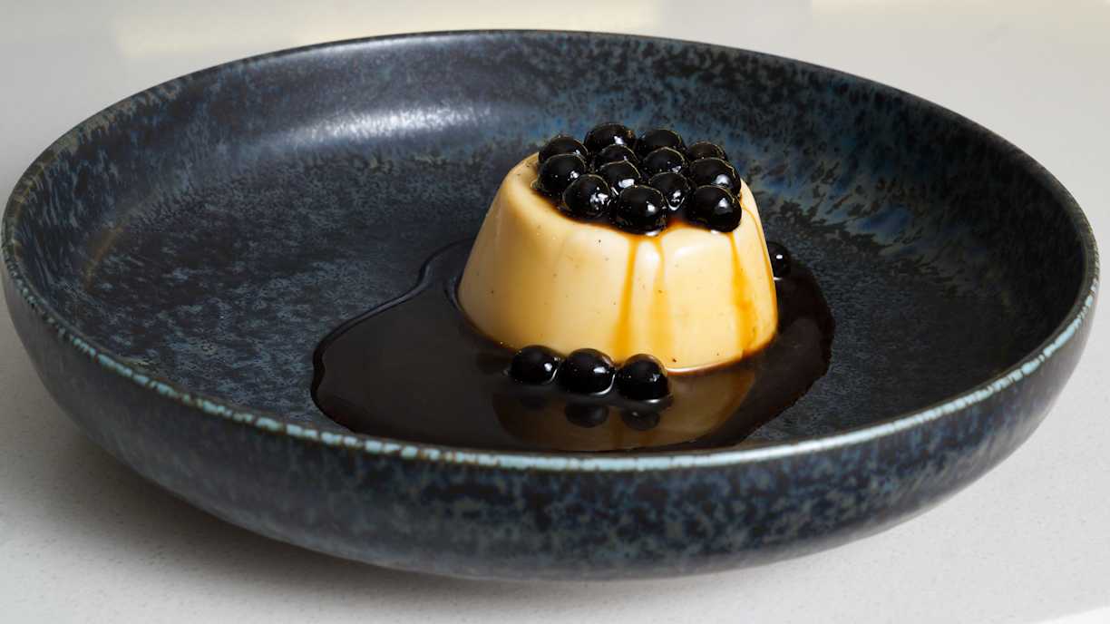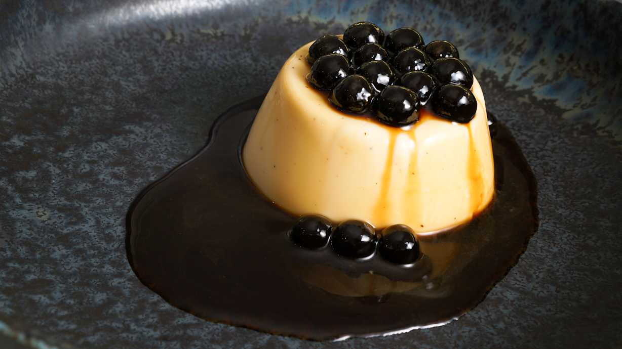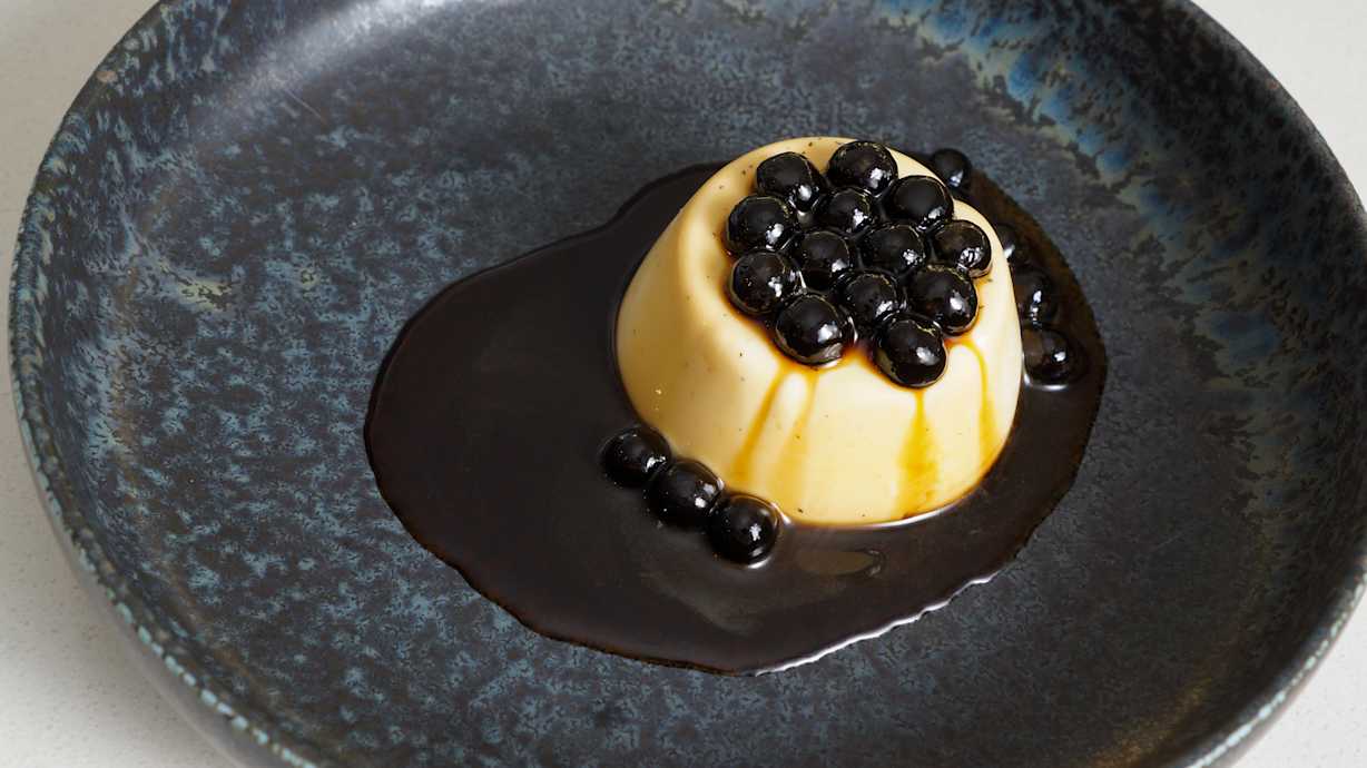 - Spoon the pearls and brown sugar syrup over the panna cotta.